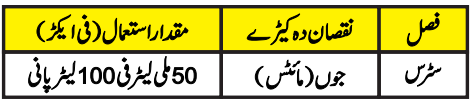 طریقہ استعمال: سب سے پہلے پانی کی مقدار فی ایکڑ کا تعین کریں۔ اس تعین کردہ مقدار میں زہر کی سفارش کردہ مقدار کا محلول بنا کر کسی اچھے اسپرئیر سے پودوں کے تمام حصوں پر اسپرے کریں۔